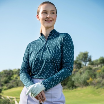 Available now for TGI Partners, the SS26 Ladies Sun Protection line, features high performance fabrics with UPF 50+ protection, breathability and moisture-wicking properties. Lightweight polos, cooling long sleeves and mock neck tops offer UV defense for effective sun protection, while ensuring unrestricted movement and comfort on the course